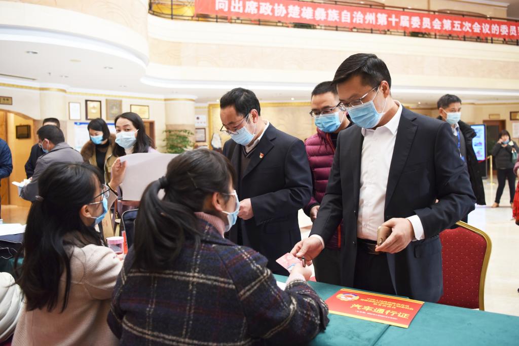 参加政协楚雄彝族自治州第十届委员会第五次会议的政协委员到会议报到点报到。记者 夏天彧 摄