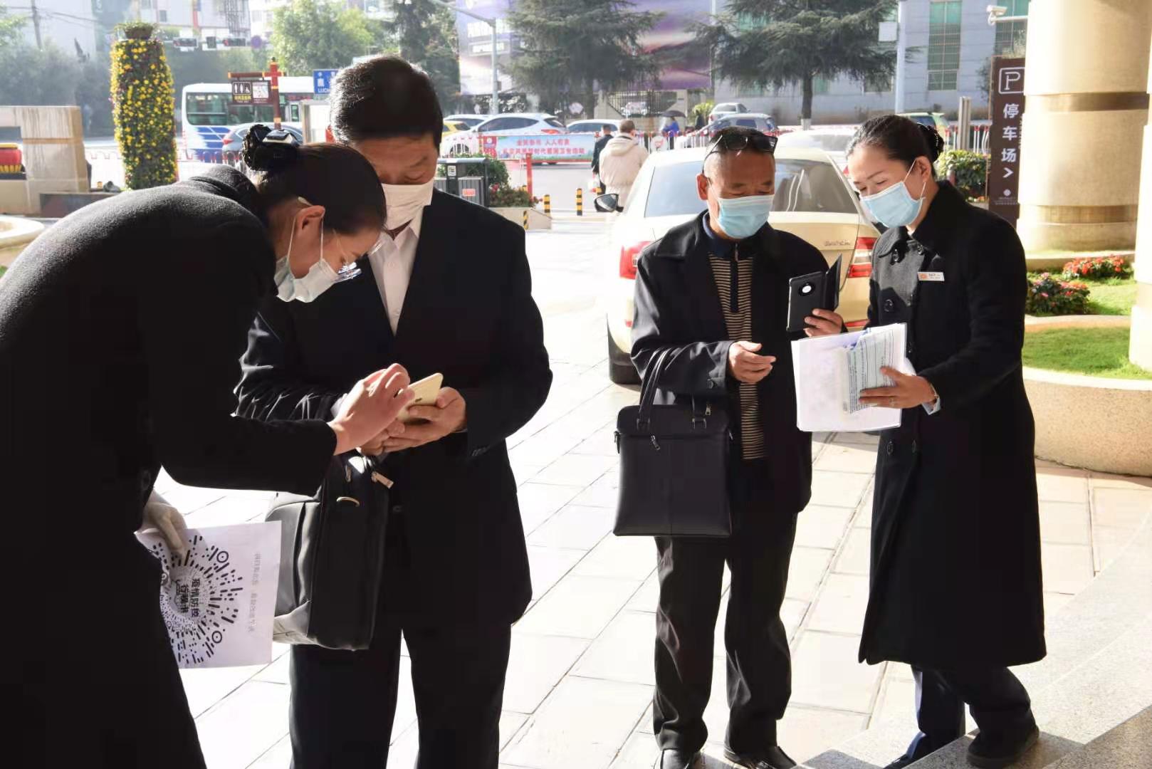 参加政协楚雄彝族自治州第十届委员会第五次会议的政协委员出示手机健康码和测量体温后进入会议报到点报到住宿准备参会。记者 夏天彧 摄