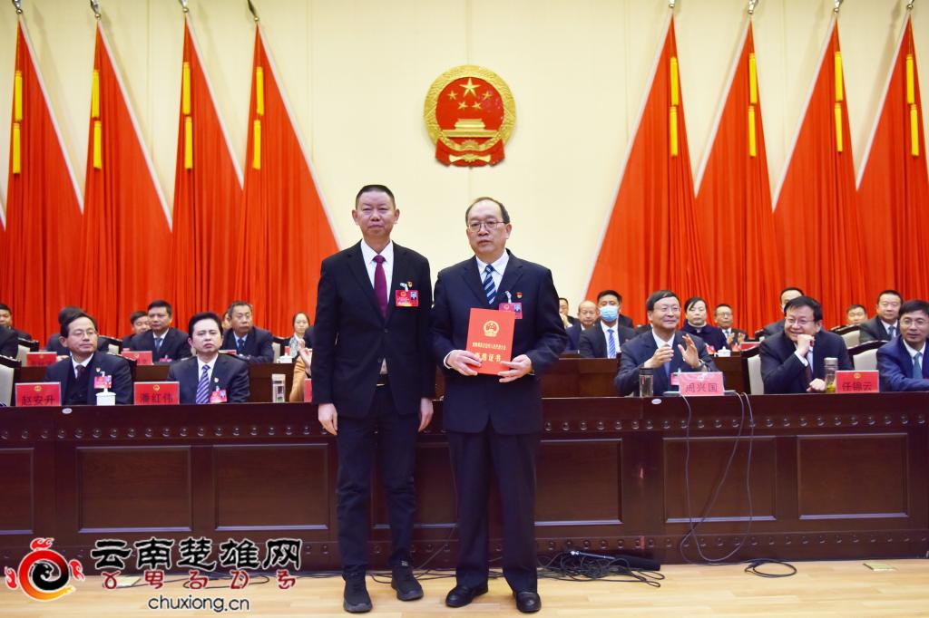 州委副书记李明向当选的楚雄彝族自治州第十二届人大常委会副主任颁发当选证书。记者 王洪 摄