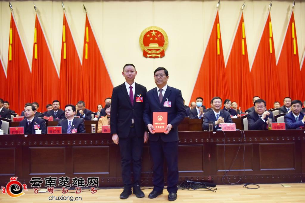 李明向当选的楚雄彝族自治州人大常委会副主任杨仕坤、李云升颁发了当选证书。