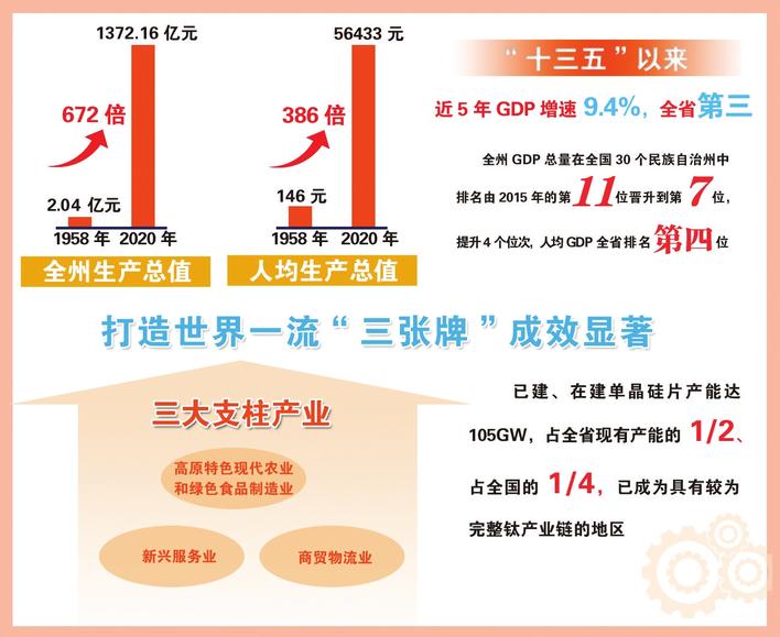 全州生产总值由1958年的2.04亿元增加到2020年的1372.16亿元,人均生产总值由146元增加到56433元,分别增长了672倍、386倍。尤其是党的十八大以来,全州干部群众牢记并践行习近平总书记考察云南时提出的“努力闯出一条跨越式发展的路子来”的谆谆教诲,奋力推动楚雄州实现高质量跨越式发展。