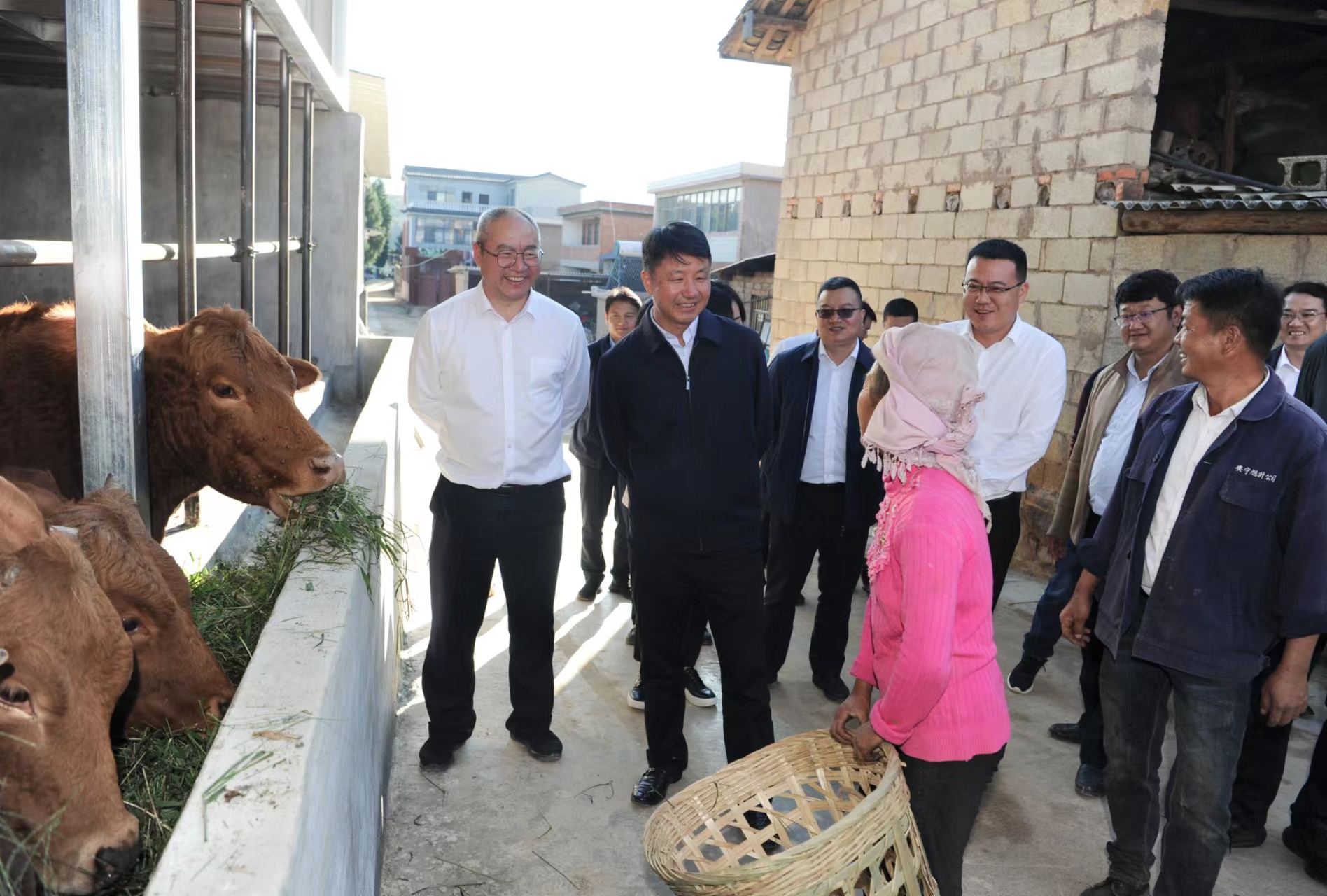 州委书记刘勇在武定县狮山镇椅子甸村委会康乐村调研人居环境提升工作和肉牛养殖产业。(楚雄日报全媒体记者 高建波 摄)