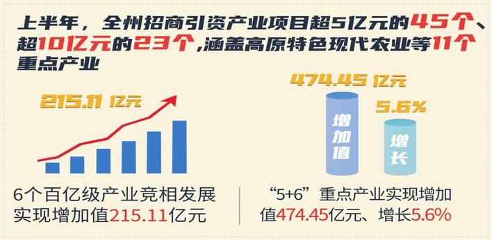 上半年,全州招商引资产业项目超5亿元的45个、超10亿元的23个,涵盖高原特色现代农业等11个重点产业。6个百亿级产业竞相发展,实现增加值215.11亿元。全州“5+6”重点产业实现增加值474.45亿元、增长5.6%。