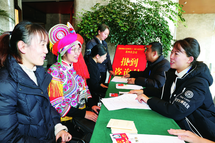 出席楚雄州第十三届人民代表大会第四次会议的代表向大会报到。 (记者 夏天彧 摄)