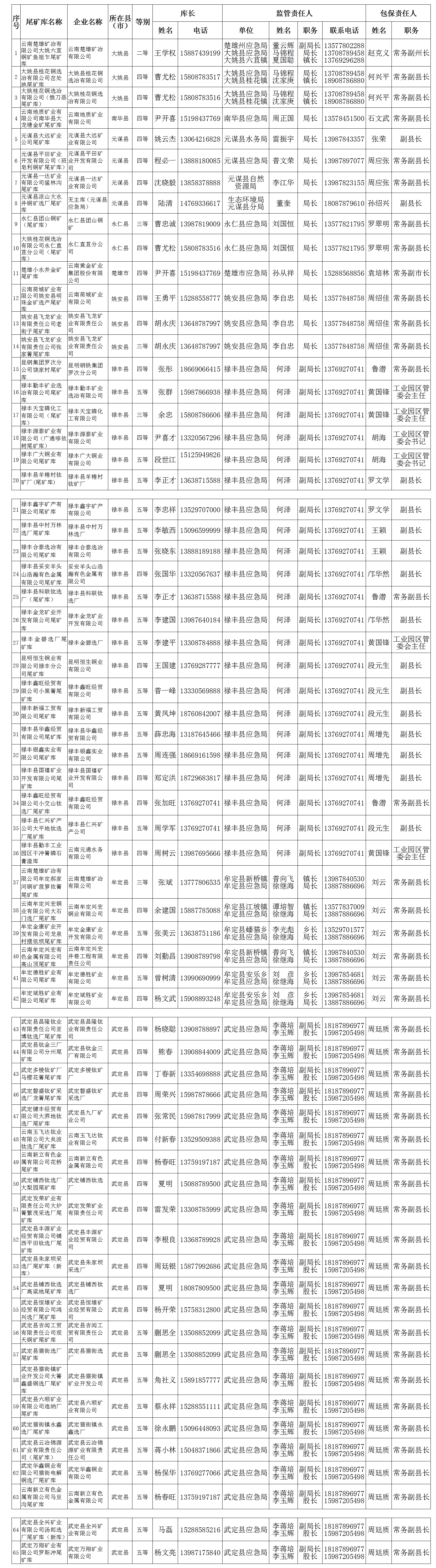 根据《中华人民共和国安全生产法》、《尾矿库安全监督管理规定》、《云南省应急管理厅云南省生态环境厅关于印发云南省尾矿库风险隐患排查治理工作方案的通知》、《云南省应急管理厅关于实施尾矿库安全生产包保制度的通知》的相关规定及要求,为切实落实尾矿库安全监管包保责任,现对我州尾矿库安全监管包保责任人员公示如下: