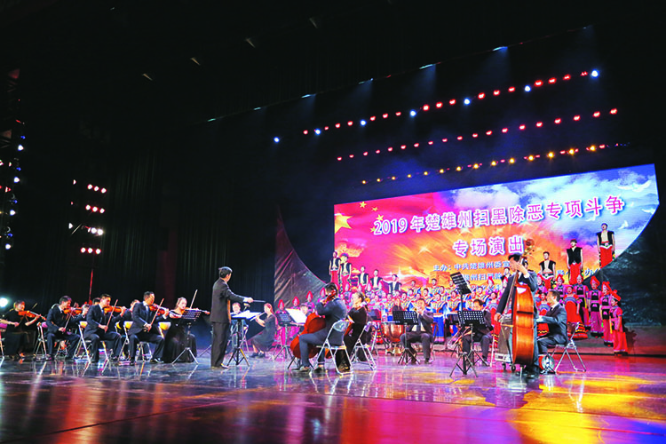 4月11日晚,由州委宣传部、州扫黑除恶专项斗争领导小组办公室、州文化和旅游局主办,州民族艺术剧院承办的2019年楚雄州扫黑除恶专项斗争专场文艺演出在彝州大剧院举行。州委书记杨斌要求,要以群众喜闻乐见的文艺形式,加强对扫黑除恶专项斗争政策法规的宣传,引导群众树立“扫黑除恶人人有责”的意识,激发全社会积极参与支持扫黑除恶专项斗争的积极性,在全州上下形成对黑恶势力高压严打的社会震慑氛围,为全州扫黑除恶专项斗争向纵深推进提供强有力的舆论支持。