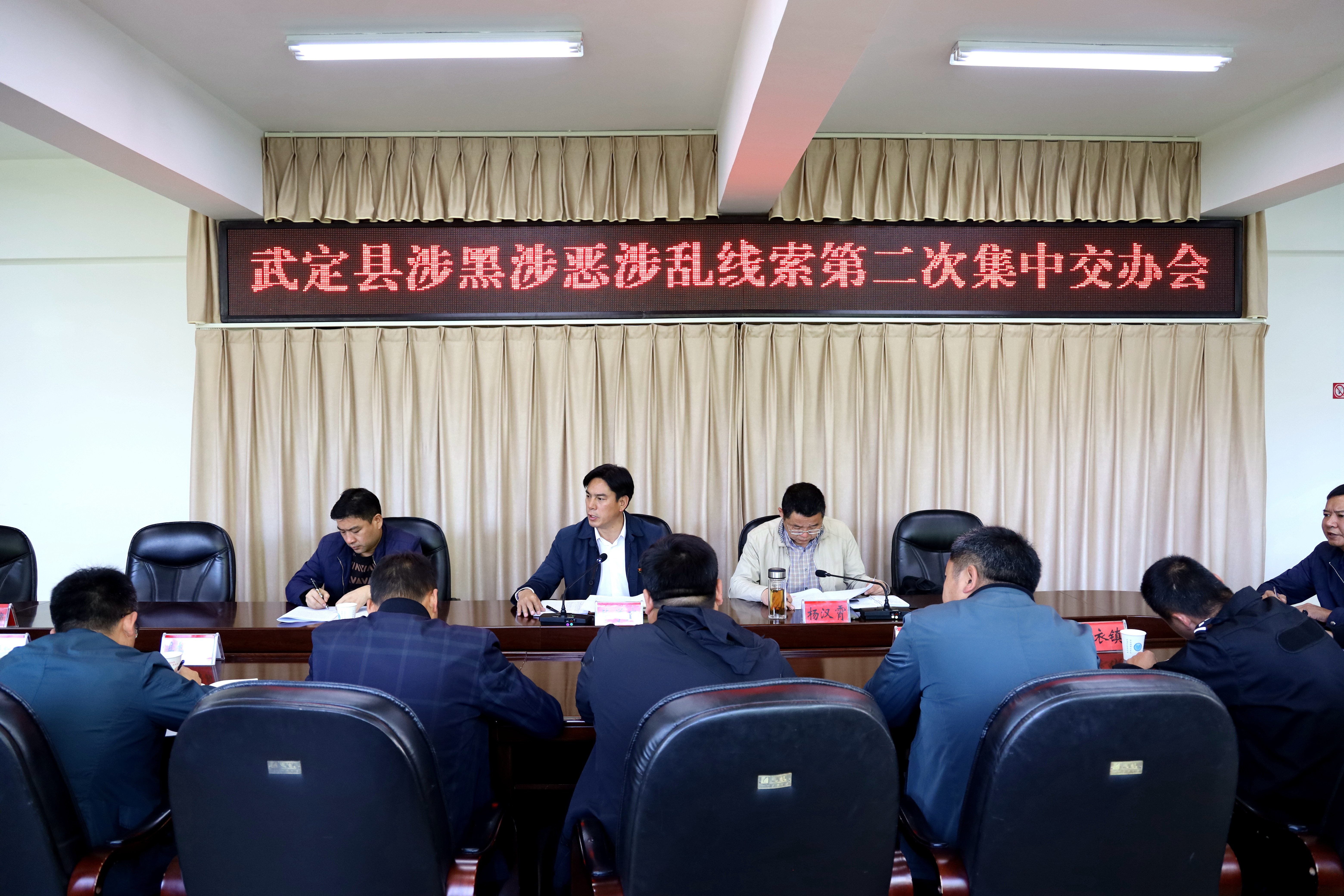 会议通报了近期武定县扫黑除恶专项斗争领导小组办公室收到的举报线索,以及县、乡、村三级摸排的涉黑涉恶涉乱线索情况,并对22件涉黑涉恶涉乱线索分别向涉及线索交办的7家单位和5个乡镇进行集中交办。