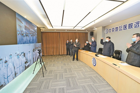 自今年1月12日起,首都医科大学附属北京地坛医院开始承担新冠肺炎患者的救治、筛查、隔离工作,收治了北京市第一例确诊病例。习近平来到地坛医院门诊楼一层运行监控中心,通过监控画面察看患者住院诊疗情况,并视频连线正在病房值班的医务人员,鼓励他们继续完善诊疗方案,继续全力以赴救治患者,努力提高收治率和治愈率、降低感染率和病亡率,并叮嘱他们做好自我防护。