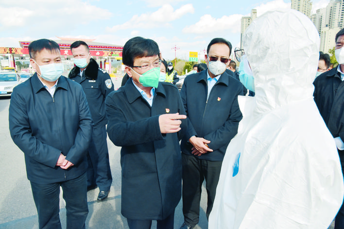州委书记杨斌,州委副书记、州长迟中华率队到楚雄西收费站实地检查疫情防控工作。 (记者 王 洪摄)