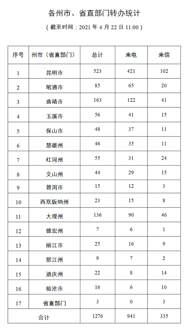 截至4月22日上午11:00,督察组交办群众举报投诉生态环境问题共十六批1276件(来电941件、来信335件);其中,昆明市523件,曲靖市163件,大理州136件,昭通市85件,玉溪市56件,红河州55件,保山市48件,楚雄州46件,文山州44件,丽江市25件,西双版纳州23件,迪庆州22件,临沧市16件,普洱市15件,怒江州9件,德宏州7件,省直部门直接办理3件。