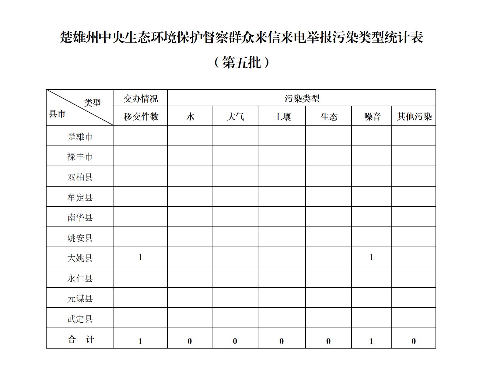 2024年5月14日,中央第七生态环境保护督察组向楚雄州转办第五批群众信访举报件1件。其中:来电0件,来信1件。从信访举报件生态环境问题污染类型来看,涉及噪音1件。从县市来看,大姚县1件。截至当日,楚雄州已累计收到中央第七生态环境保护督察组转办的信访举报件5件,所有举报件均已及时转交相关县(市)处理。
