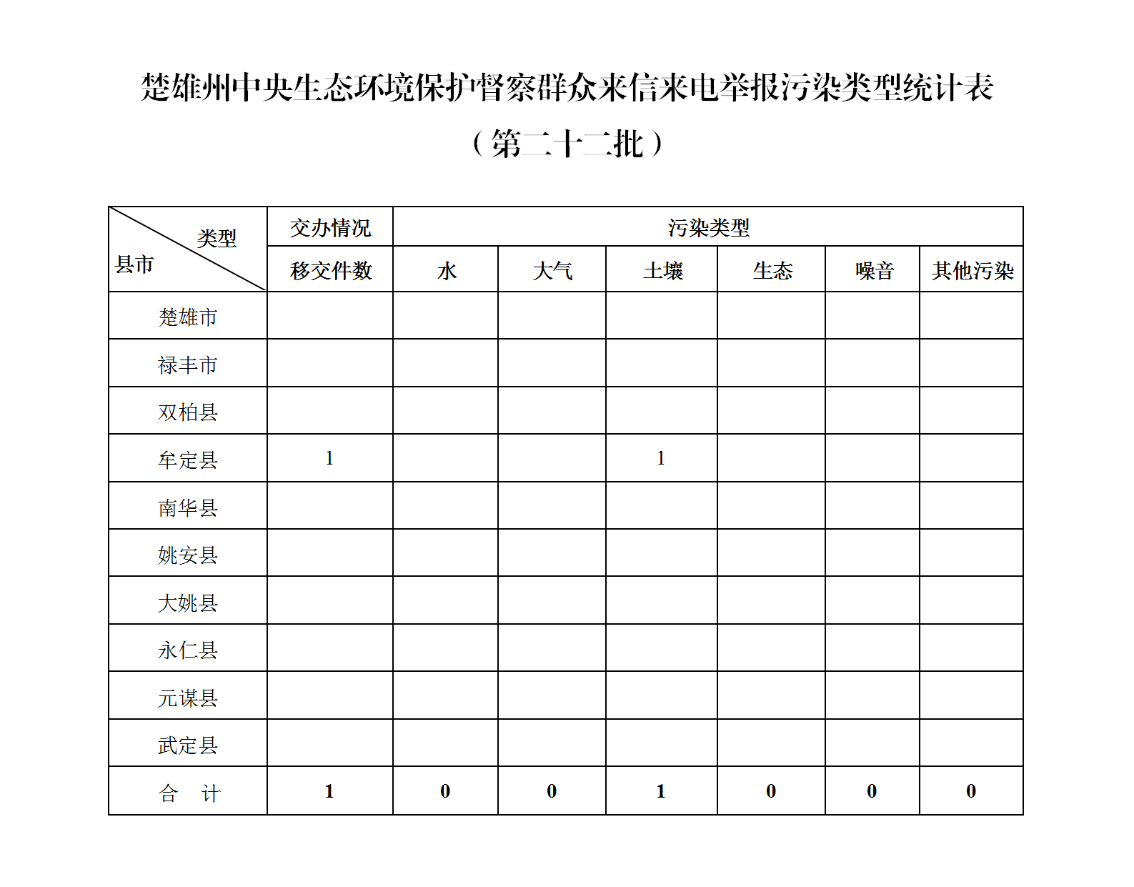 2024年5月31日,中央第七生态环境保护督察组向楚雄州转办第二十二批群众信访举报件1件。其中:来电1件,来信0件。从信访举报件生态环境问题污类型来看,涉及土壤1件。从县市来看,牟定县1件。截至当日,楚雄州已累计收到中央第七生态环境保护督察组转办的信访举报件67件,所有举报件均已及时转交相关县(市)处理。