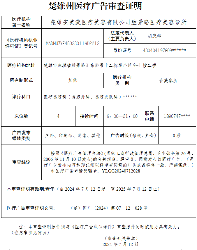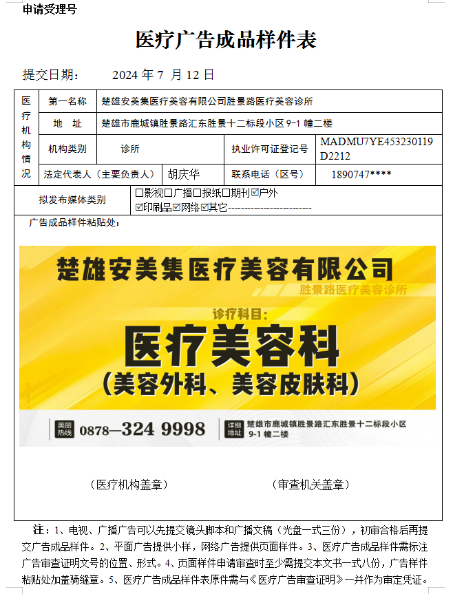 楚雄安美集医疗美容有限公司胜景路医疗美容诊所——医疗广告审查证明