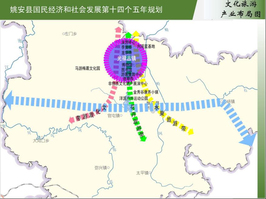 ——文化旅游康养目的地。大力彰显光禄古镇国家级历史文化名镇、全省重点开发建设型特色旅游小镇、全省第一批十佳宜居小镇和国家AAAA级旅游景区等品牌效应,充分挖掘光禄古镇、龙华寺、武侯祠、文峰塔等历史民族文化资源,利用马游梅葛文化生态保护区和特色旅游村、下口坝等生态资源和高原特色优质农产品资源,把姚安打造成全省文化旅游康养目的地。