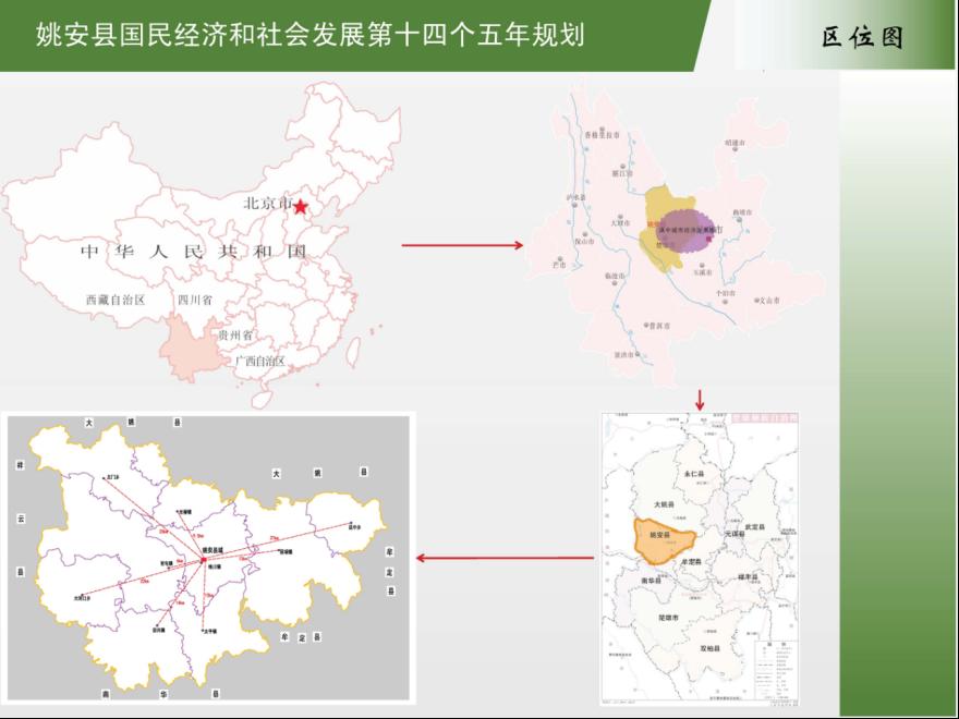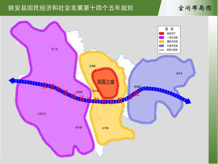 “十四五”时期,以姚安高质量发展为主线,结合楚中“1+4+1”城镇群和环楚雄“半小时经济圈”发展思路,充分遵循自然规律、经济规律和社会规律,按照资源共享、产业互补、重点突破、集群发展的思路,重点打造“一城、一廊、三流域”发展新格局。